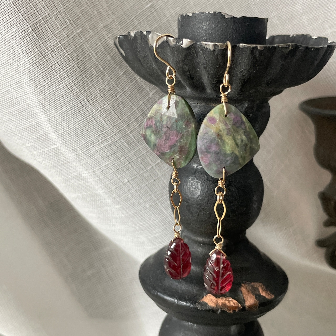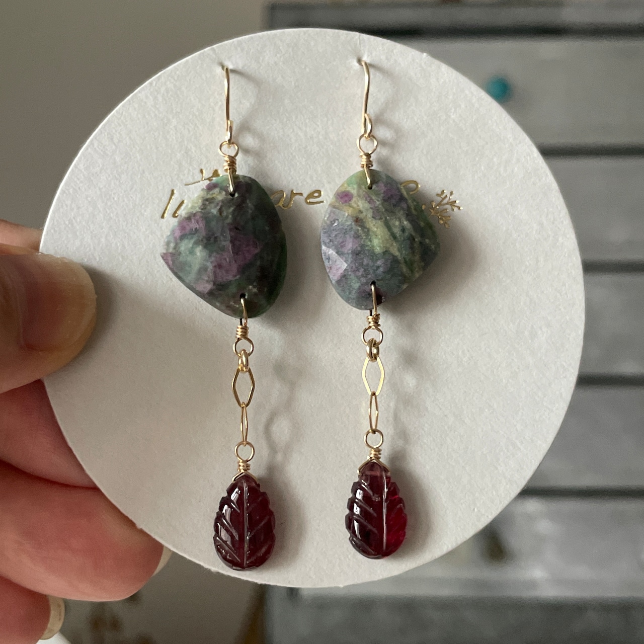 ルビーインフックサイト×ガーネット葉 絵画ピアス