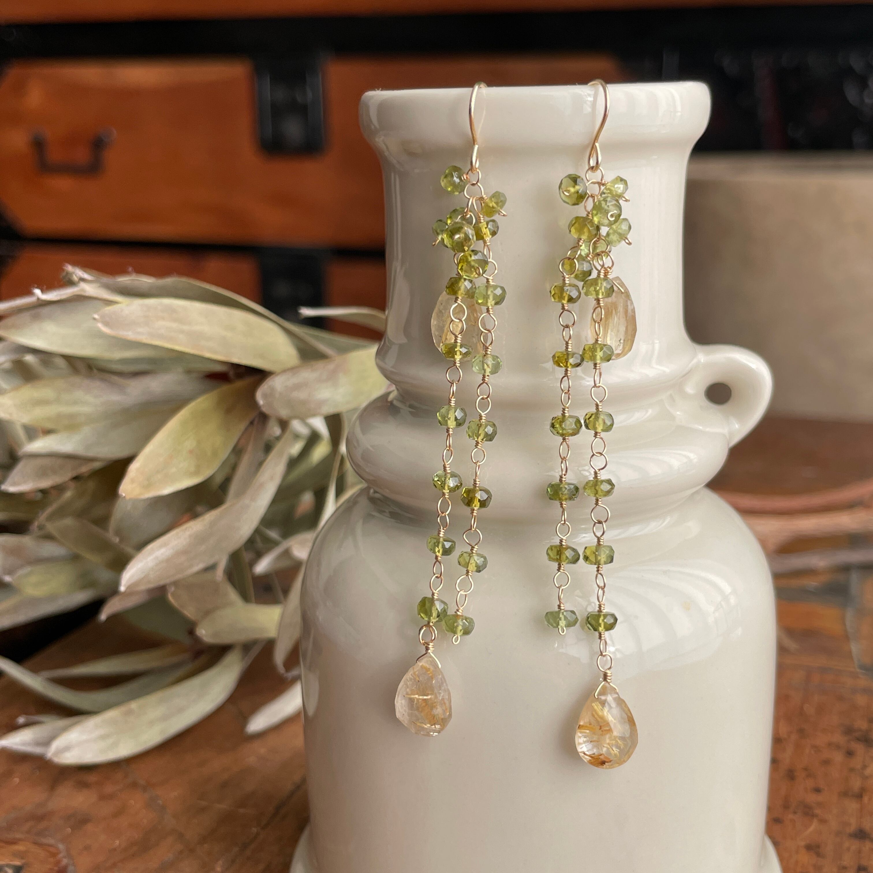 ゴールドルチル×グリーントルマリン ロングピアス