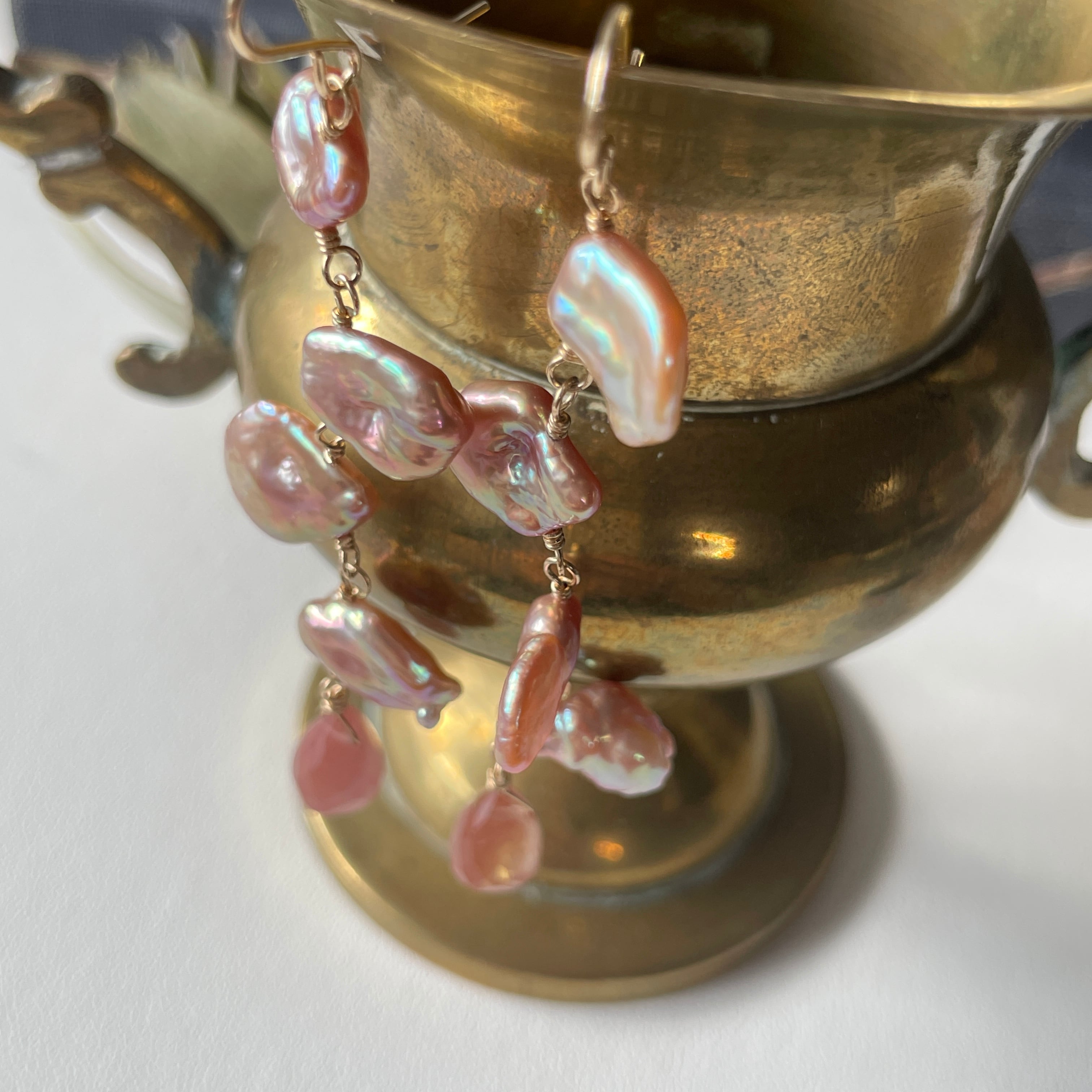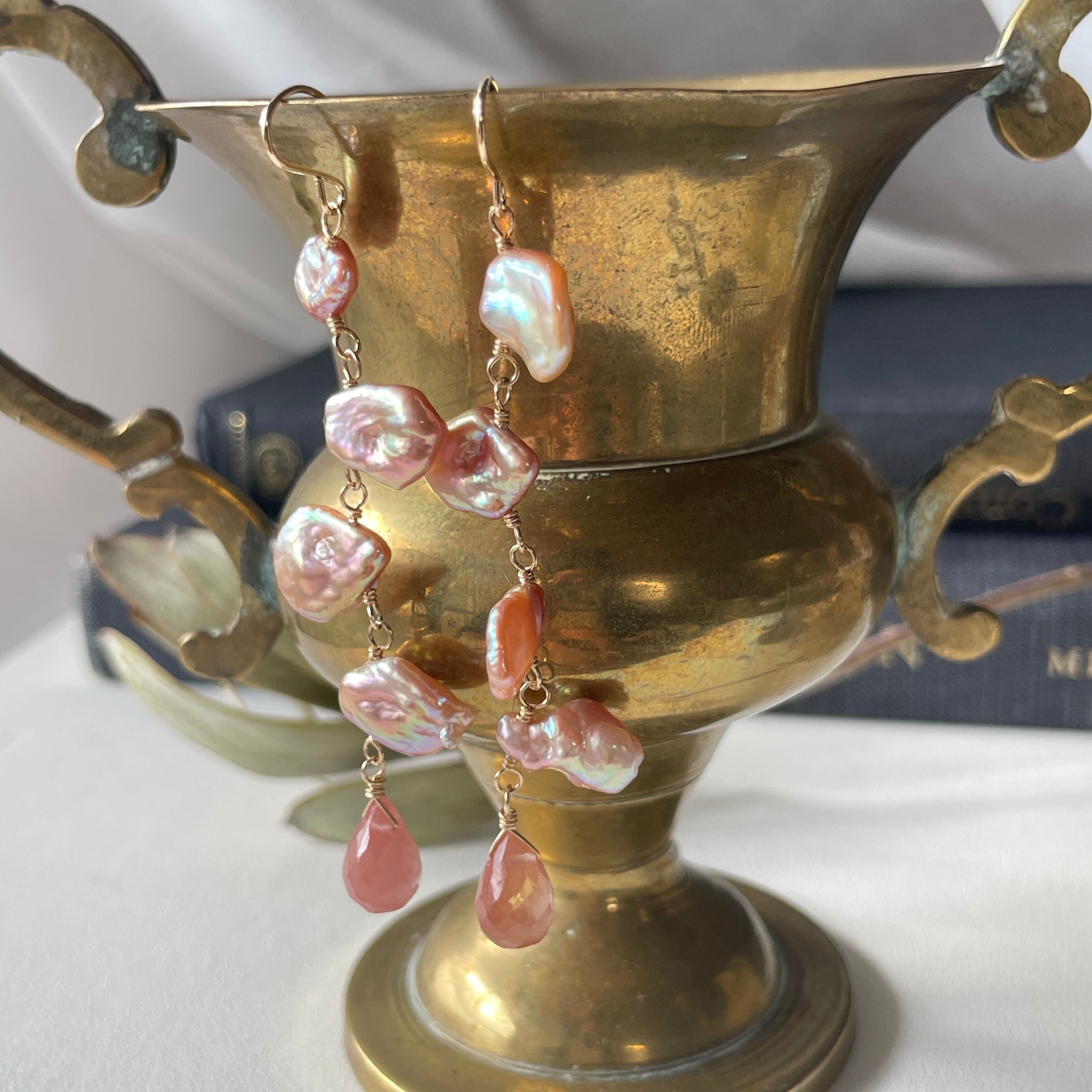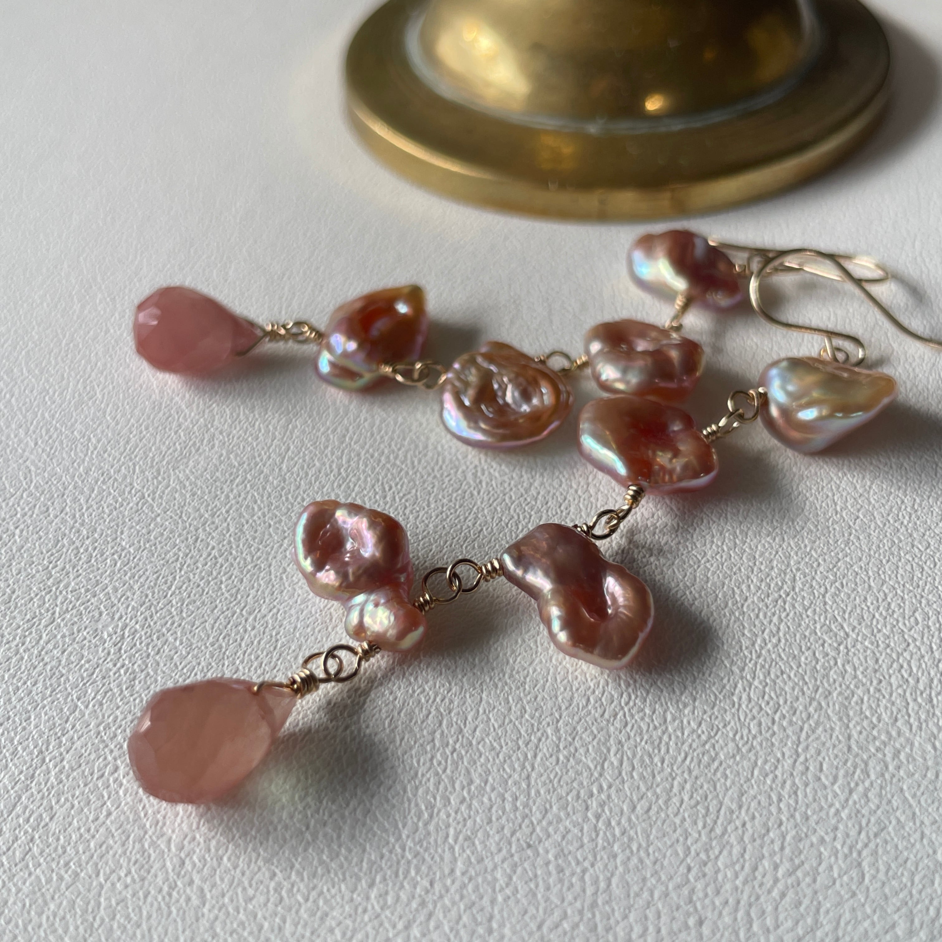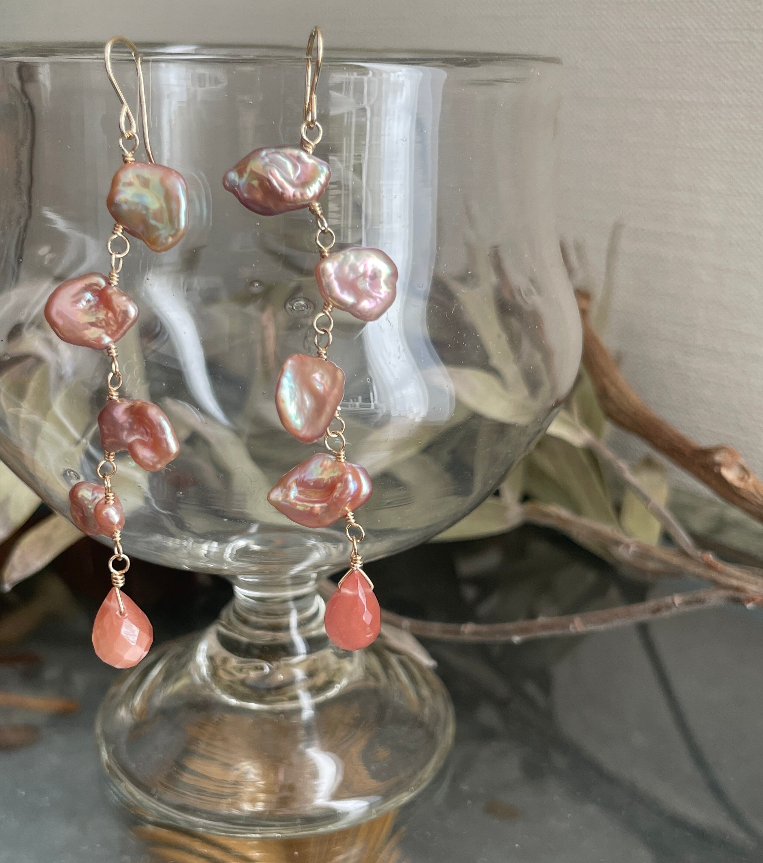 虹色の光が美しいナチュラルピンクの淡水パール。優しいカラーのアンデシンを組み合わせました。