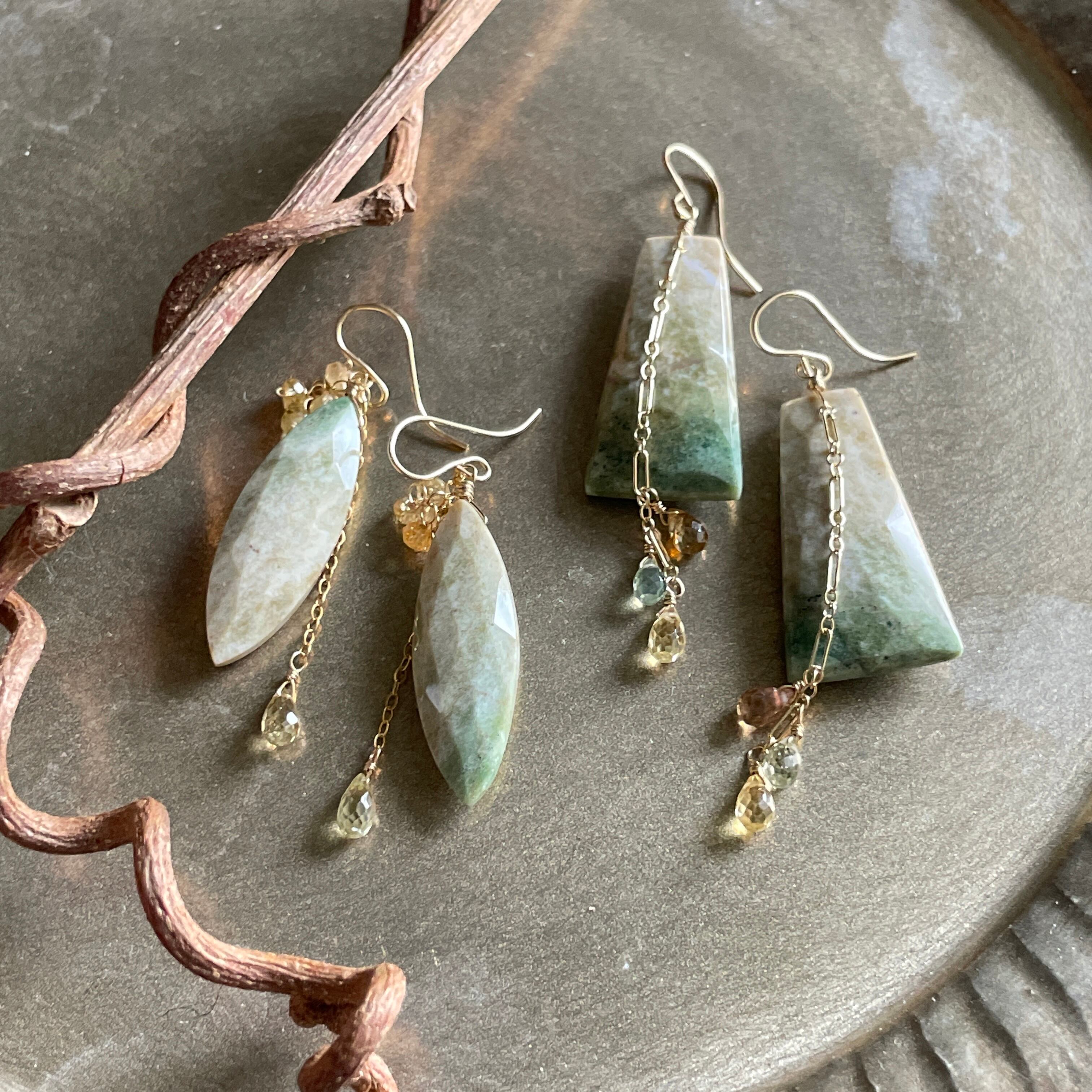 グラデーションカラーのジャスパーが美しいピアス。小粒とドロップのジルコンはチェーンをスライドすることでお好きアレンジ可能です。